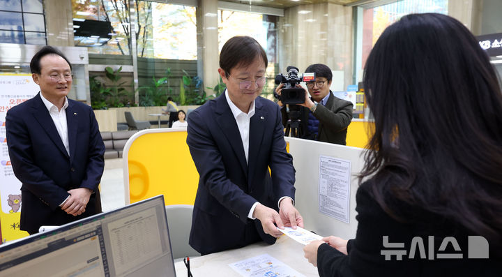 [서울=뉴시스] 김선웅 기자 = 이찬진 금융감독원장이 14일 서울 여의도 KB국민은행 여의도영업부를 방문해 보이스피싱 피해 예방을 위한 오픈뱅킹 안심차단서비스에 가입하며 현장을 점검하고 있다. 왼쪽은 이환주 KB국민은행장. 2025.11.14. [email protected]