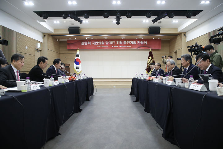 [서울=뉴시스] 고승민 기자 = 장동혁 국민의힘 대표가 14일 서울 마포구 한국중견기업연합회에서 열린 당대표 초청 간담회에서 인사말을 하고 있다. (사진=국민의힘 제공) 2025.11.14. [email protected] *재판매 및 DB 금지