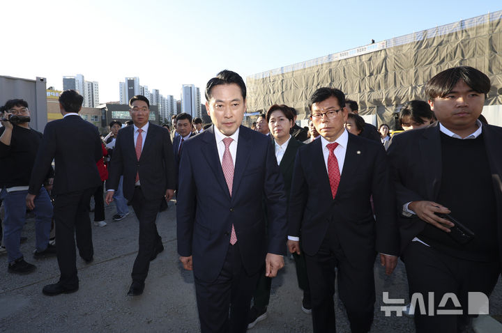 [성남=뉴시스] 김근수 기자 = 장동혁 국민의힘 당대표와 국민의힘 의원들이 14일 경기 성남시 대장동 사회기반시설 공사현장을 찾아 현장을 살펴보고 있다. 2025.11.14. [email protected]