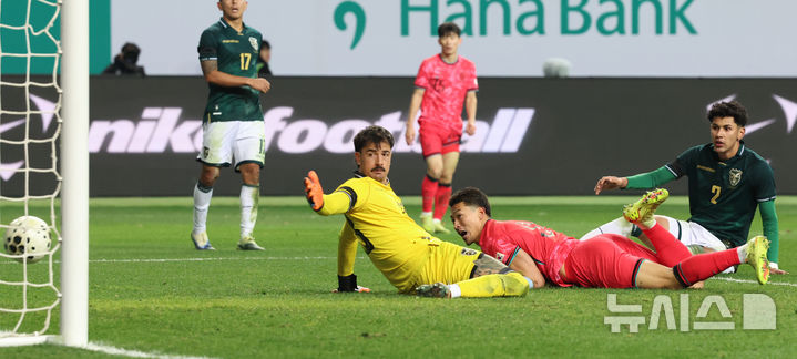 [대전=뉴시스] 강종민 기자 = 14일 오후 대전 유성구 대전월드컵경기장에서 열린 축구 국가대표팀 평가전 대한민국과 볼리비아의 경기에서 한국 조규성이 추가골을 넣고 있다. 2025.11.14. [email protected]