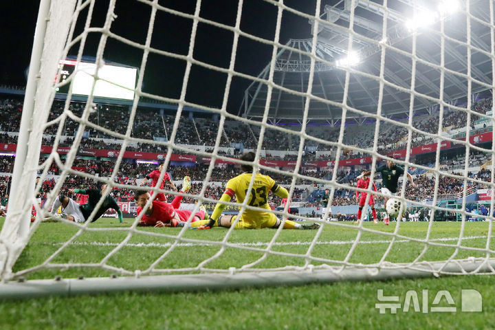 [대전=뉴시스] 조성우 기자 = 14일 오후 대전 유성구 대전월드컵경기장에서 열린 축구 국가대표팀 평가전 대한민국과 볼리비아의 경기, 후반전 한국 조규성이 팀의 두 번째 골을 넣고 있다. 2025.11.14. [email protected]