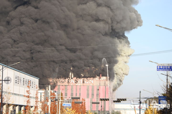 [천안=뉴시스] 최영민 기자=15일 오전 6시 8분께, 충남 천안시 풍세면 이랜드물류센터에서 화재가 발생했다. 화재로 인해 주변으로 많은 연기가 번지고 있다. 2025.11.15 [email protected]