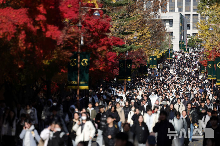 [서울=뉴시스] 홍효식 기자 = 15일 오전 서울 종로구 성균관대학교에서 열린 2026학년도 수시모집 논술시험을 마친 수험생들이 고사장을 나서고 있다. 2025.11.15. [email protected]
