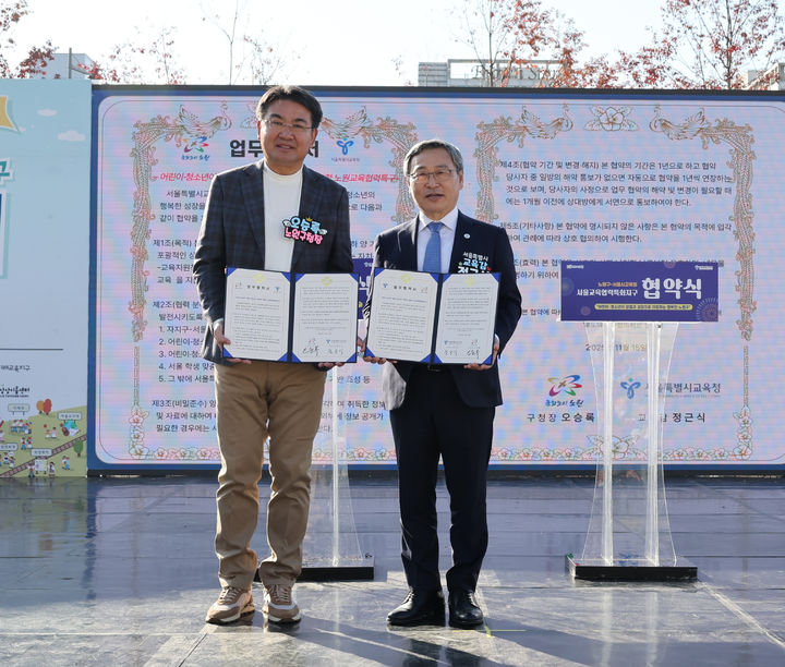 [서울=뉴시스] 김근수 기자 = 정근식 서울시교육감과 오승록 노원구청장이 15일 서울 노원구 등나무문화공원에서 ‘노원교육협력특화지구’ 업무협약을 체결하고 기념촬영을 하고 있다. (사진= 서울시교육청 제공) 2025.11.15. [email protected] *재판매 및 DB 금지