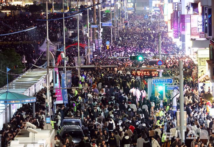 [부산=뉴시스] 하경민 기자 = '제20회 부산불꽃축제'가 열린 15일 부산 수영구 광안리해수욕장 인근 도로에 관람객들이 몰려 발 디딜 틈 없이 붐비고 있다. 2025.11.15. [email protected]