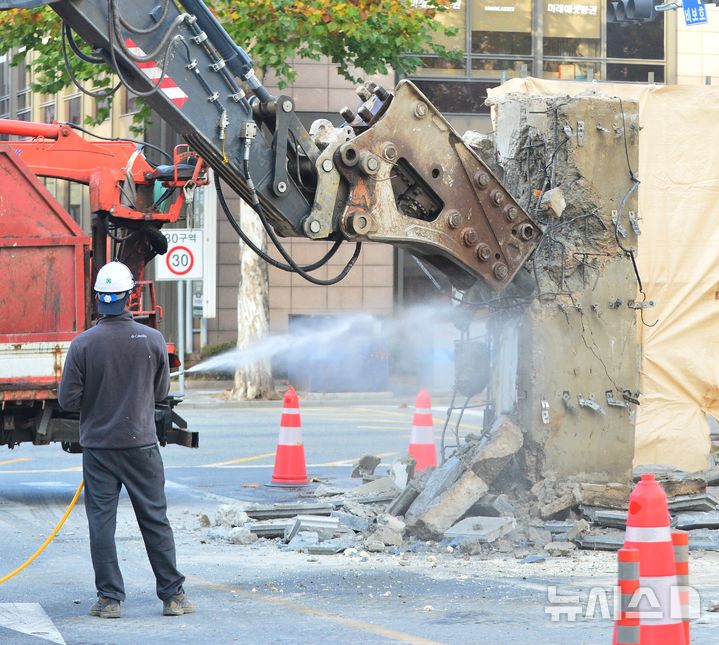 [청주=뉴시스] 서주영 기자 = 16일 오전 충북도청 서문 철거 작업이 진행되고 있다. 충북도는 청사 시설 개선 계획에 따라 서문을 철거한 뒤 소규모 광장과 차량 통행용 도로를 신설할 예정이다. 2025.11.16. [email protected]