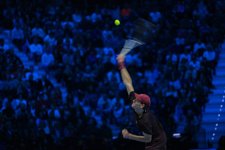 [토리노=AP/뉴시스] 얀니크 신네르(2위·이탈리아)가 15일(현지 시간) 이탈리아 토리노에서 열린 2025 남자프로테니스(ATP) 파이널 단식 준결승에서 앨릭스 디미노어(7위·호주)와 경기하고 있다. 2연패를 노리는 신네르가 2-0(7-5 6-2)으로 이기고 결승에 올라 카를로스 알카라스(1위·스페인)와 우승을 다툰다. 2025.11.16.
