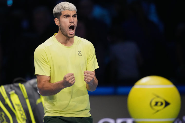 [토리노=AP/뉴시스] 카를로스 알카라스(1위·스페인)가 15일(현지 시간) 이탈리아 토리노에서 열린 2025 남자프로테니스(ATP) 파이널 단식 준결승에서 펠릭스 오제알리아심(8위·캐나다)을 꺾고 세리머니하고 있다. 알카라스가 2-0(6-2 6-4)으로 승리하고 결승에 올라 2연패를 노리는 얀니크 신네르(2위·이탈리아)와 우승을 다툰다. 2025.11.16.