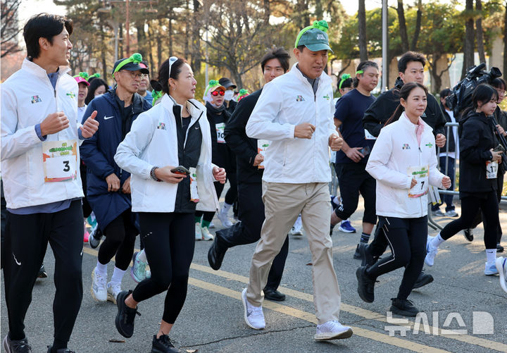 [서울=뉴시스] 이영환 기자 = 오세훈 서울시장이 16일 오전 서울 마포구 상암월드컵공원 평화광장에서 열린 2025 서울 쉬엄쉬엄 런에 참석해 홍보대사인 배우 이재윤, 김윤서 코치, 가수 겸 배우 한승연 및 참가자들과 힘찬 출발을 하고 있다. 2025.11.16. [email protected]