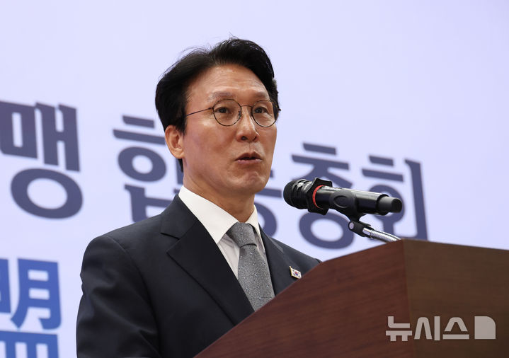 [서울=뉴시스] 김금보 기자 = 김민석 국무총리가 16일 서울 여의도 국회 의원회관에서 열린 제45차 한일·일한의원연맹 합동총회에서 축사를 하고 있다. 2025.11.16. [email protected]
