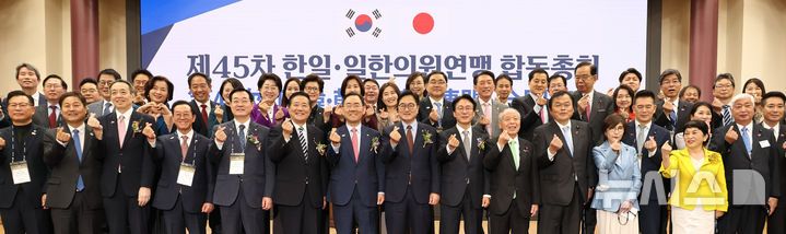 [서울=뉴시스] 김금보 기자 = 김민석 국무총리, 우원식 국회의장, 주호영 한일의원연맹 회장, 나가시마 아키히사 일본 간사장을 비롯한 한일 의원들이 16일 서울 여의도 국회 의원회관에서 열린 제45차 한일·일한의원연맹 합동총회에서 기념촬영을 하고 있다. 2025.11.16. [email protected]