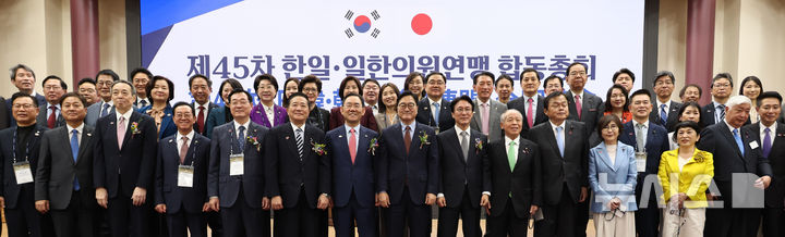 [서울=뉴시스] 김금보 기자 = 김민석 국무총리, 우원식 국회의장, 주호영 한일의원연맹 회장, 나가시마 아키히사 일본 간사장을 비롯한 한일 의원들이 16일 서울 여의도 국회 의원회관에서 열린 제45차 한일·일한의원연맹 합동총회에서 기념촬영을 하고 있다. 2025.11.16. [email protected]