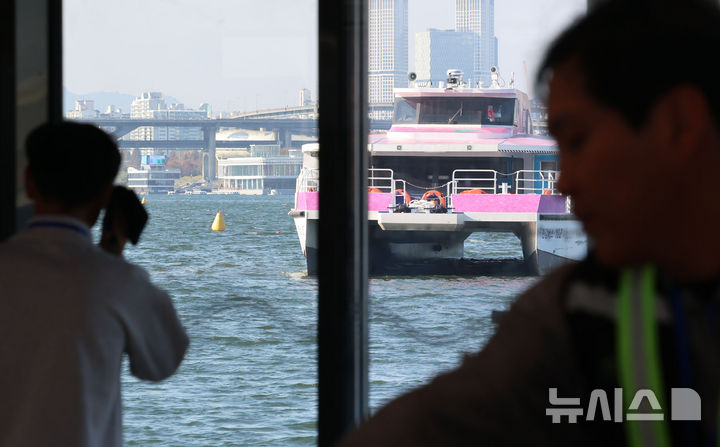 [서울=뉴시스] 권창회 기자 = 16일 서울 송파구 잠실선착장 인근에 한강버스가 운항 중단된 채 멈춰있다. 한강버스는 지난 15일 잠실선착장 인근 강바닥에 걸려 멈춰 일부 구간이 운항 중단됐다. 2025.11.16. [email protected]