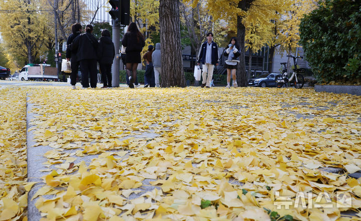 [서울=뉴시스] 김명원 기자 = 완연한 가을이 다가온 16일 서울 종로구 도렴동에 은행나뭇잎이 떨어져 노랗게 물들여놓은 거리를 시민들이 걷고 있다. 기상청에 따르면 늦은 오후부터 밤사이 수도권과 강원내륙·산지에, 밤부터 충청권과 전북에 가끔 비가 내리는 곳이 있겠다고 예보했다. 2025.11.16. [email protected]