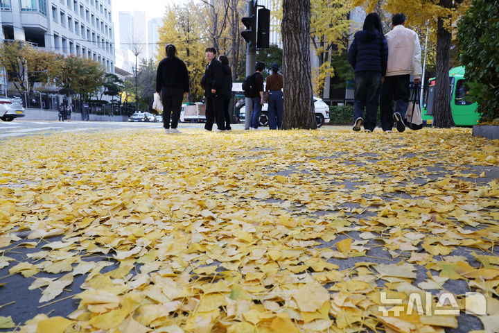 [서울=뉴시스] 김명원 기자 = 완연한 가을이 다가온 16일 서울 종로구 도렴동에 은행나뭇잎이 떨어져 노랗게 물들여놓은 거리를 시민들이 걷고 있다. 기상청에 따르면 늦은 오후부터 밤사이 수도권과 강원내륙·산지에, 밤부터 충청권과 전북에 가끔 비가 내리는 곳이 있겠다고 예보했다. 2025.11.16. [email protected]