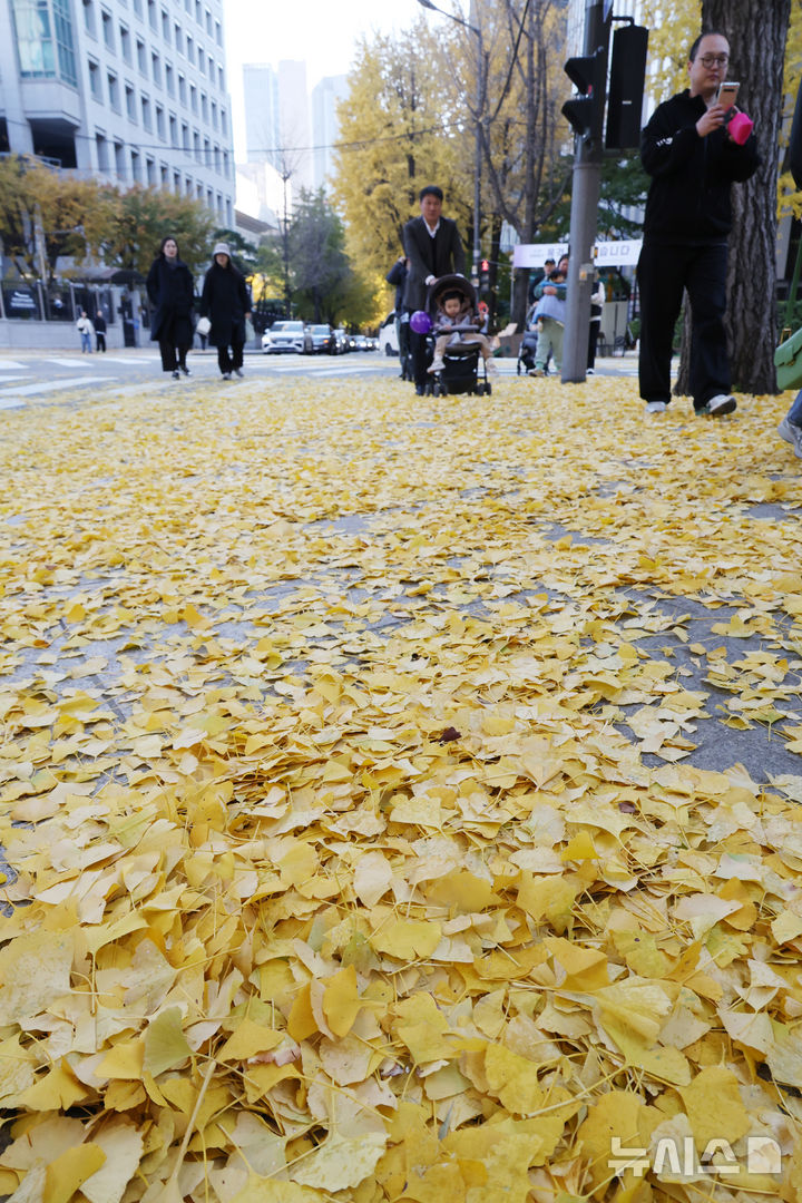 [서울=뉴시스] 김명원 기자 = 완연한 가을이 다가온 16일 서울 종로구 도렴동에 은행나뭇잎이 떨어져 노랗게 물들여놓은 거리를 시민들이 걷고 있다. 기상청에 따르면 늦은 오후부터 밤사이 수도권과 강원내륙·산지에, 밤부터 충청권과 전북에 가끔 비가 내리는 곳이 있겠다고 예보했다. 2025.11.16. [email protected]