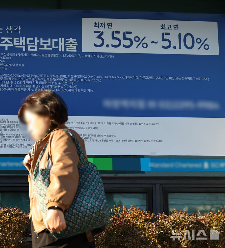4대 은행의 금융채 5년 기준 고정형 주담대 금리는 연 3.93~6.06%로 이달 초 연 3.68~5.83% 대비 0.23~0.25%p 가량 뛰었다. 사진은 16일 서울 한 은행에 붙은 주담대 관련 안내문의 보습. 2025.11.16. [email protected]