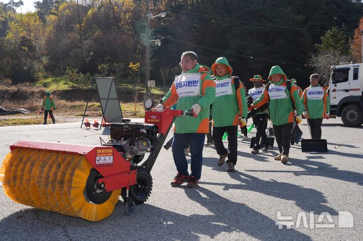 [음성=뉴시스] 충북 음성군 지역자율방재단이 17일 봉학골산림욕장 주차장에서 제설 장비를 활용한 '겨울철 자연재난 대응 특화훈련'을 하고 있다. (사진=음성군 제공) 2025.11.17. [email protected]