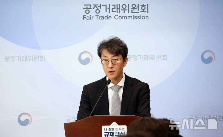 [세종=뉴시스] 강종민 기자 = 최장관 공정거래위원회 기업집단감시국장이 17일 세종시 정부세종청사에서 우미 소속 회사들이 공공택지 1순위 입찰 자격인 주택건설 실적 300세대를 충족시켜 줄 목적으로 총수 2세를 포함한 5개 계열회사에 일감을 제공하는 행위에 대해 시정명령과 과징금 483억 7900만 원을 부과하고 우미건설을 고발한다고 밝히고 있다. 2025.11.17. [email protected]