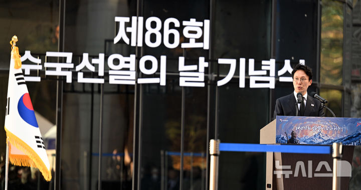 [서울=뉴시스] 청사사진기자단 = 김민석 국무총리가 17일 오후 서울 노원구 육군사관학교에서 열린 순국선열의 날 기념식에서 기념사를 하고 있다. 2025.11.17. [email protected]