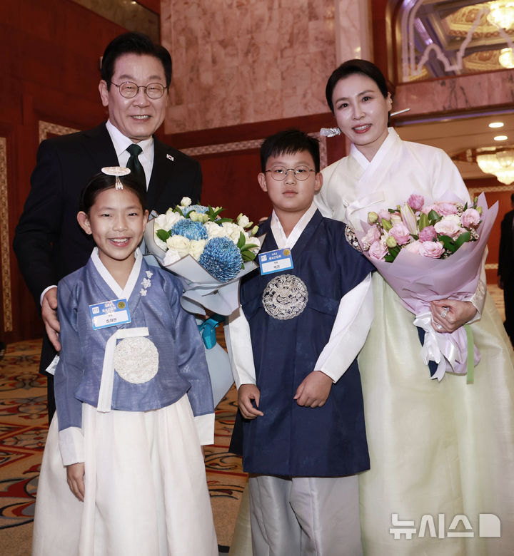 화동들과 함께 기념촬영 하는 이재명 대통령과 김혜경 여사