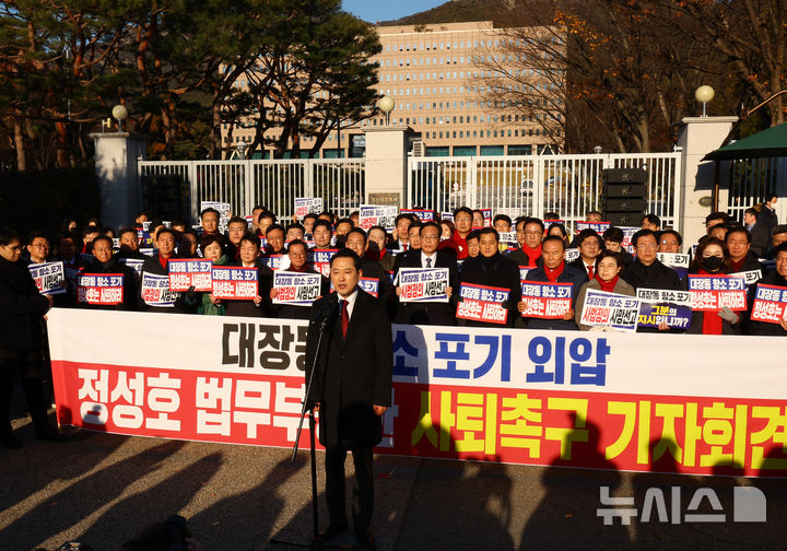 [과천=뉴시스] 박주성 기자 = 국민의힘 장동혁 대표가 18일 오전 경기도 정부과천청사 앞에서 대장동 항소포기 외압 정성호 법무부장관 사퇴 촉구 기자회견에서 발언을 하고 있다. 2025.11.18. [email protected]