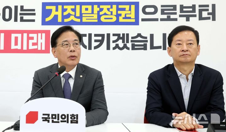 [서울=뉴시스] 조성봉 기자 = 송언석 국민의힘 원내대표가 18일 오전 서울 여의도 국회에서 열린 현안 관련 기자간담회에서 발언을 하고 있다. 오른쪽은 최은석 원내수석대변인. 2025.11.18. [email protected]