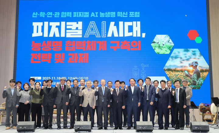 [서울=뉴시스] 이영환 기자 = 이승돈 농촌진흥청장이 18일 전북 전주시 전북대학교에서 열린 실물 인공지능 농생명 혁신 공개 토론회에 참석해 양오봉 전북대학교 총장 등과 기념촬영을 하고 있다. (사진=농촌진흥청 제공) 2025.11.18. [email protected] *재판매 및 DB 금지