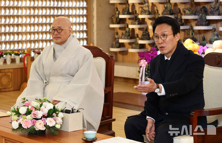 [서울=뉴시스] 청사사진기자단 = 김민석 국무총리가 18일 오후 서울 종로구 조계사에서 열린 산재사망 희생자 추모 위령재 시작에 앞서 산재 피해 유가족 등과 차담회를 하고 있다. 2025.11.18. [email protected]