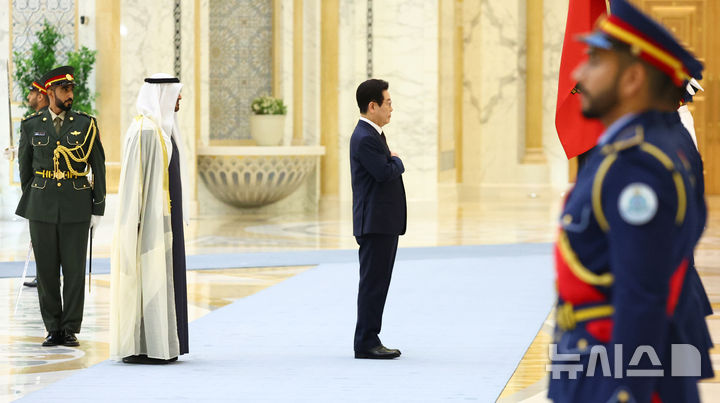 [아부다비=뉴시스] 최동준 기자 = 아랍에미리트(UAE)를 국빈 방문 중인 이재명 대통령이 18일(현지 시간) 아부다비 카사르 알 와탄 대통령궁에서 열린 공식 환영식에서 국민의례를 하고 있다. 2025.11.18. [email protected]