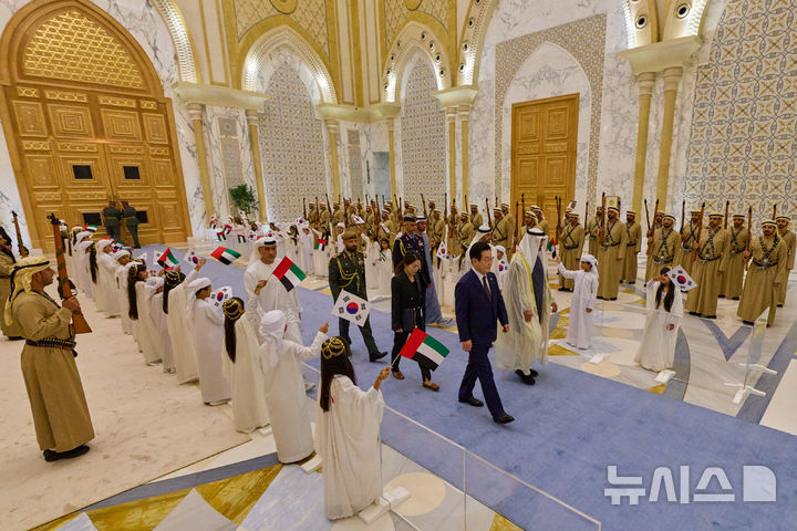 [아부다비=뉴시스] 최동준 기자 = 아랍에미리트(UAE)를 국빈 방문 중인 이재명 대통령이 18일(현지 시간) 아부다비 카사르 알 와탄 대통령궁에서 열린 공식 환영식에서 무함마드 빈 자이드 알 나흐얀 UAE 대통령과 참석하고 있다. (공동취재) 2025.11.18. [email protected]