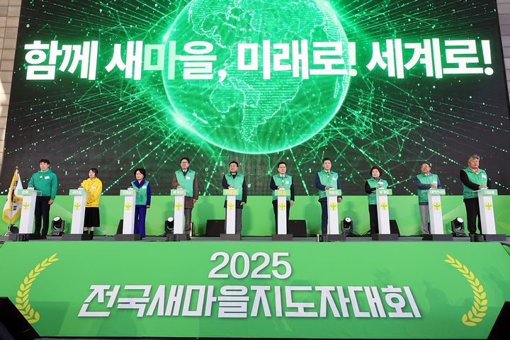 [서울=뉴시스] 윤호중 행정안전부 장관이 18일 오전 부산 해운대구 영화의전당에서 열린 '2025 전국새마을지도자대회'에 참석하여 관계자들과 대회 퍼포먼스 버튼을 터치하고 있다. (사진=행정안전부 제공) 2025.11.18. [email protected] *재판매 및 DB 금지