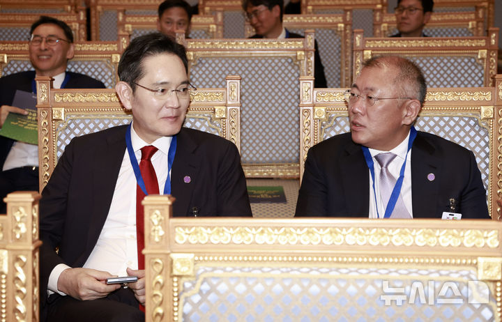 [아부다비=뉴시스] 최동준 기자 = 이재용 삼성전자 회장과 정의선 현대차그룹 회장이 18일(현지 시간) 아부다비 카사르 알 와탄 대통령궁에서 열린 이재명 대통령 아랍에미리트(UAE) 국빈 방문 계기 '문화, UAE와 한국을 잇다' 한-UAE 문화교류 행사에서 대화를 하고 있다. 2025.11.18. [email protected]