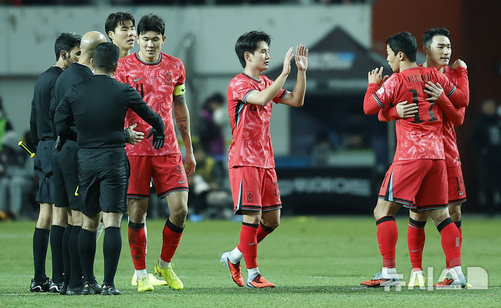 [서울=뉴시스] 정병혁 기자 = 18일 오후 서울 마포구 서울월드컵경기장에서 열린 축구 국가대표팀 평가전 대한민국과 가나의 경기, 1-0으로 승리한 대한민국 선수들이 기뻐하고 있다. 2025.11.18. [email protected]