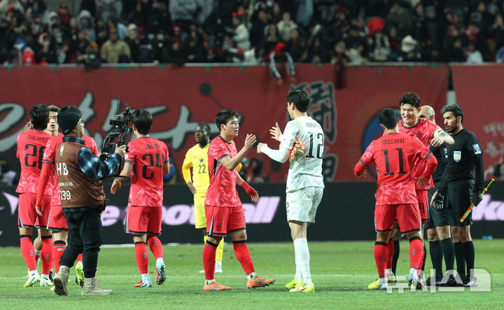 [서울=뉴시스] 홍효식 기자 = 18일 오후 서울 마포구 서울월드컵경기장에서 열린 축구 국가대표팀 평가전 대한민국과 가나의 경기, 1-0으로 승리한 대한민국 대표팀 선수들이 기뻐하고 있다. 2025.11.18. [email protected]