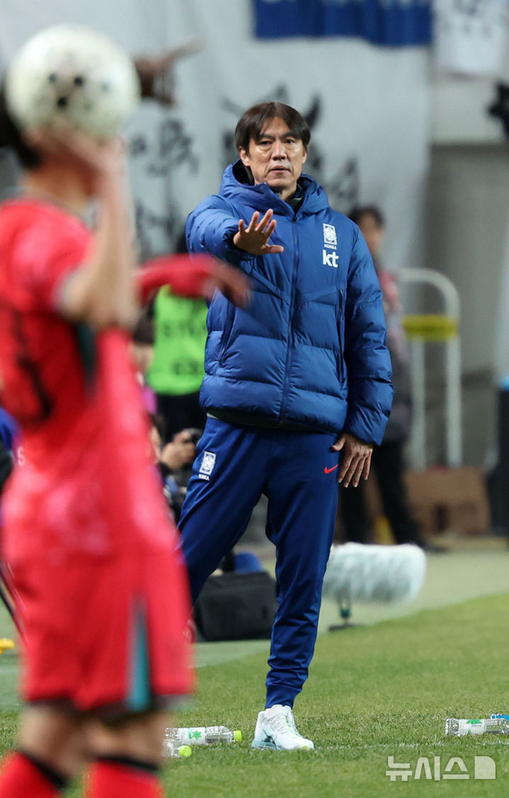 [서울=뉴시스] 홍효식 기자 = 18일 오후 서울 마포구 서울월드컵경기장에서 열린 축구 국가대표팀 평가전 대한민국과 가나의 경기, 홍명보 감독이 선수들에게 지시하고 있다. 2025.11.18. [email protected]