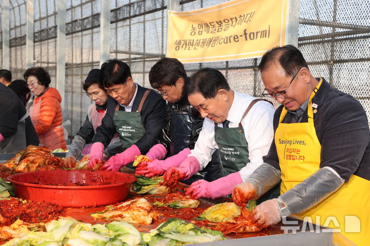 [진천=뉴시스] 송기섭(오른쪽 두 번째) 충북 진천군수와 진천군 4-H연합회 회원들이 19일 진천읍 생거진천케어팜에서 열린 김장축제에서 절임배추를 양념에 버무리고 있다. (사진=진천군 제공) 2025.11.19. [email protected]