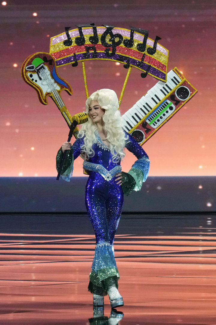 [논타부리=AP/뉴시스] 미스 스웨덴 다니엘라 룬드크비스트(Daniella Lundqvist)가 19일(현지 시간) 태국 논타부리에서 열린 제74회 미스 유니버스 전통의상 부문에서 경연하고 있다. 2025.11.19.