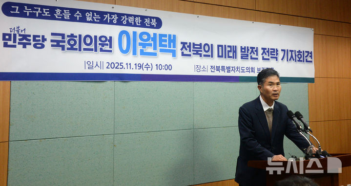 [전주=뉴시스] 김얼 기자 = 더불어민주당 김제시 이원택 국회의원이 19일 전북 전주시 전북특별자치도의회 기자회견장에서 '전북의 미래 발전 전략' 기자회견을 열고 질의에 답변하고 있다. 2025.11.19. [email protected]