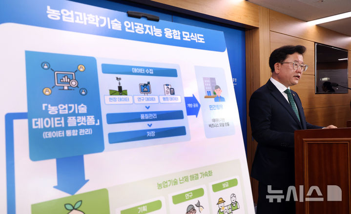 [세종=뉴시스] 강종민 기자 = 이승돈 농촌진흥청장이 19일 세종시 정부세종청사에서 '더 커가는 농업, 함께 행복한 농촌' 실현을 위한 '농업과학기술 인공지능(AI) 융합 전략'을 발표하고 있다. 2025.11.19. [email protected]
