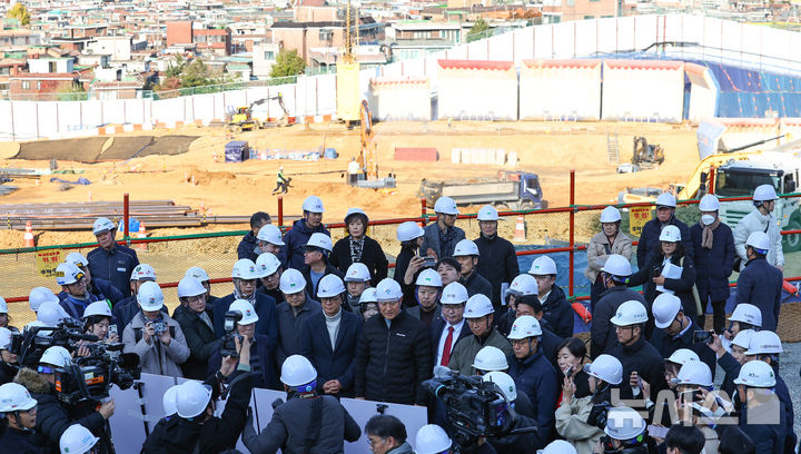 [서울=뉴시스] 최진석 기자 = 오세훈 서울시장이 19일 서울 동작구 노량진 재정비촉진지구 착공 현장(6구역)을 찾아 서울시 관계자의 현장 브리핑을 듣고 있다. 2025.11.19. [email protected]