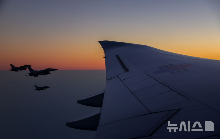 [아부다비=뉴시스] 최동준 기자 = 아랍에미리트(UAE) 국빈 방문 일정을 마친 이재명 대통령과 김혜경 여사가 탑승한 공군 1호기가 19일(현지 시간) UAE 공군 전투기의 호위 비행을 받으며 이집트로 향하고 있다. 2025.11.20. [email protected]