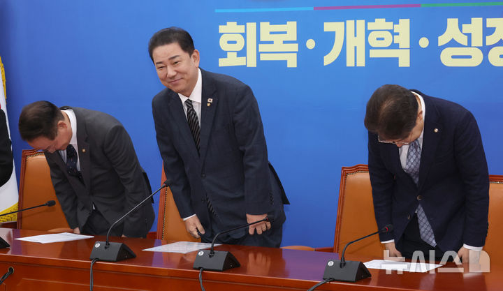 [서울=뉴시스] 김금보 기자 = 김병기 더불어민주당 원내대표가 20일 오전 서울 여의도 국회에서 열린 정책조정회의에서 인사를 하고 있다. 2025.11.20. [email protected]