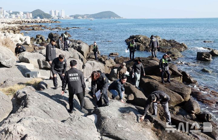 [부산=뉴시스] 하경민 기자 = 남해지방해양경찰청 소속 경찰관들과 군 관계자 등이 20일 부산 해운대구 구덕포항 인근 갯바위에서 해안가 마약류 유입을 확인하는 수색을 벌이고 있다. 2025.11.20. [email protected]