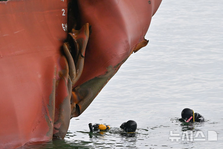 [목포=뉴시스] 이영주 기자 = 20일 오전 전남 목포시 삼학부두에 정박 중인 좌초 사고 여객선 퀸제누비아2호 주변에서 선사가 고용한 민간잠수사들이 사고 범위 확정을 위해 잠수한 뒤 선체를 확인하고 있다. 2025.11.20. [email protected]
