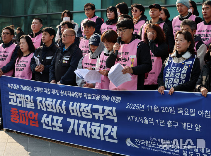 [서울=뉴시스] 이영환 기자 = 김종호 전국철도노동조합 코레일네트웍스지부장이 20일 오전 서울 용산구 서울역에서 열린 코레일 자회사 비정규직 총파업 선포 기자회견에 참석해 발언을 하고 있다. 2025.11.20. [email protected]