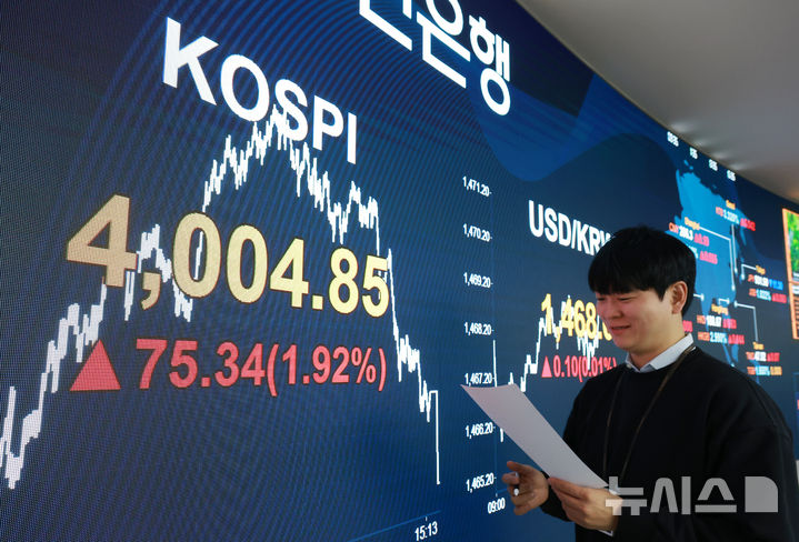 [서울=뉴시스] 고승민 기자 = 코스피가 전 거래일(3929.51)보다 75.34포인트(1.92%) 오른 4004.85에 장을 마친 20일 서울 여의도 KB국민은행 딜링룸에서 관계자가 업무를 보고 있다. 코스닥 지수는 전 거래일(871.32)보다 20.62포인트(2.37%) 상승한 891.94에 거래를 종료했다.