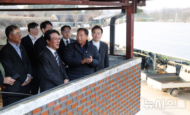 [여주=뉴시스] 청사사진기자단 = 김민석 국무총리가 20일 오후 경기 여주시 세종대왕면 구양리 마을을 방문해 태양광 발전시설을 둘러보고 있다. 2025.11.20. [email protected]