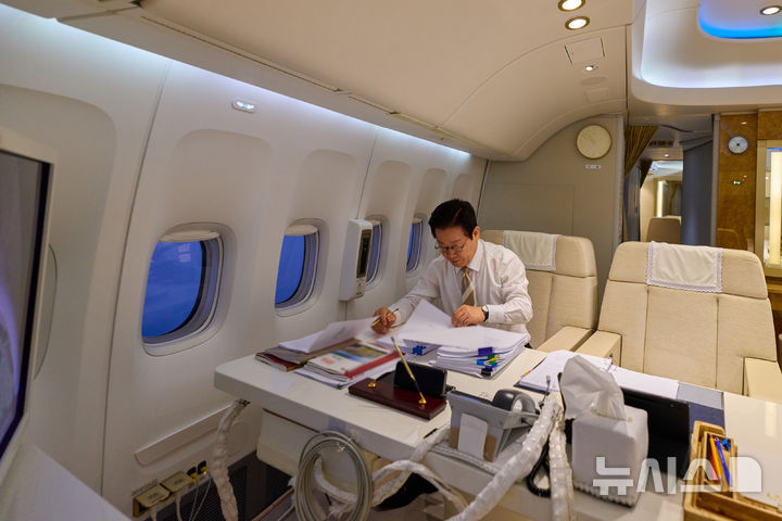 [서울=뉴시스] 대통령실은 지난 19일(현지 시간) 아랍에미리트(UAE) 국빈 방문 일정을 마치고 공군 1호기에서 집무를 보는 이재명 대통령 모습을 20일 SNS에 공개했다. (사진=이재명 대통령 SNS) 2025.11.20. [email protected]