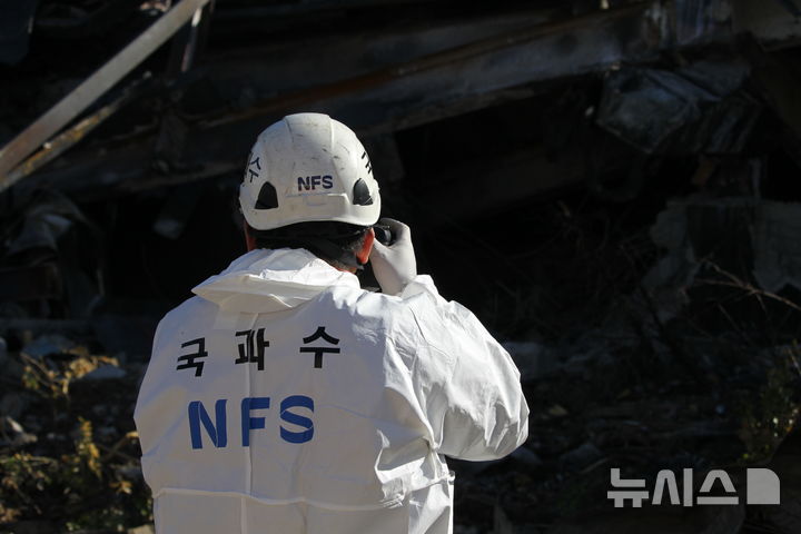 [천안=뉴시스] 최영민 기자=21일 충남 천안시 풍세면 이랜드패션 물류센터 화재현장 현장감식 도중 국립과학수사연구원 관계자가 현장 곳곳을 촬영하고 있다. 2025.11.21 [email protected]